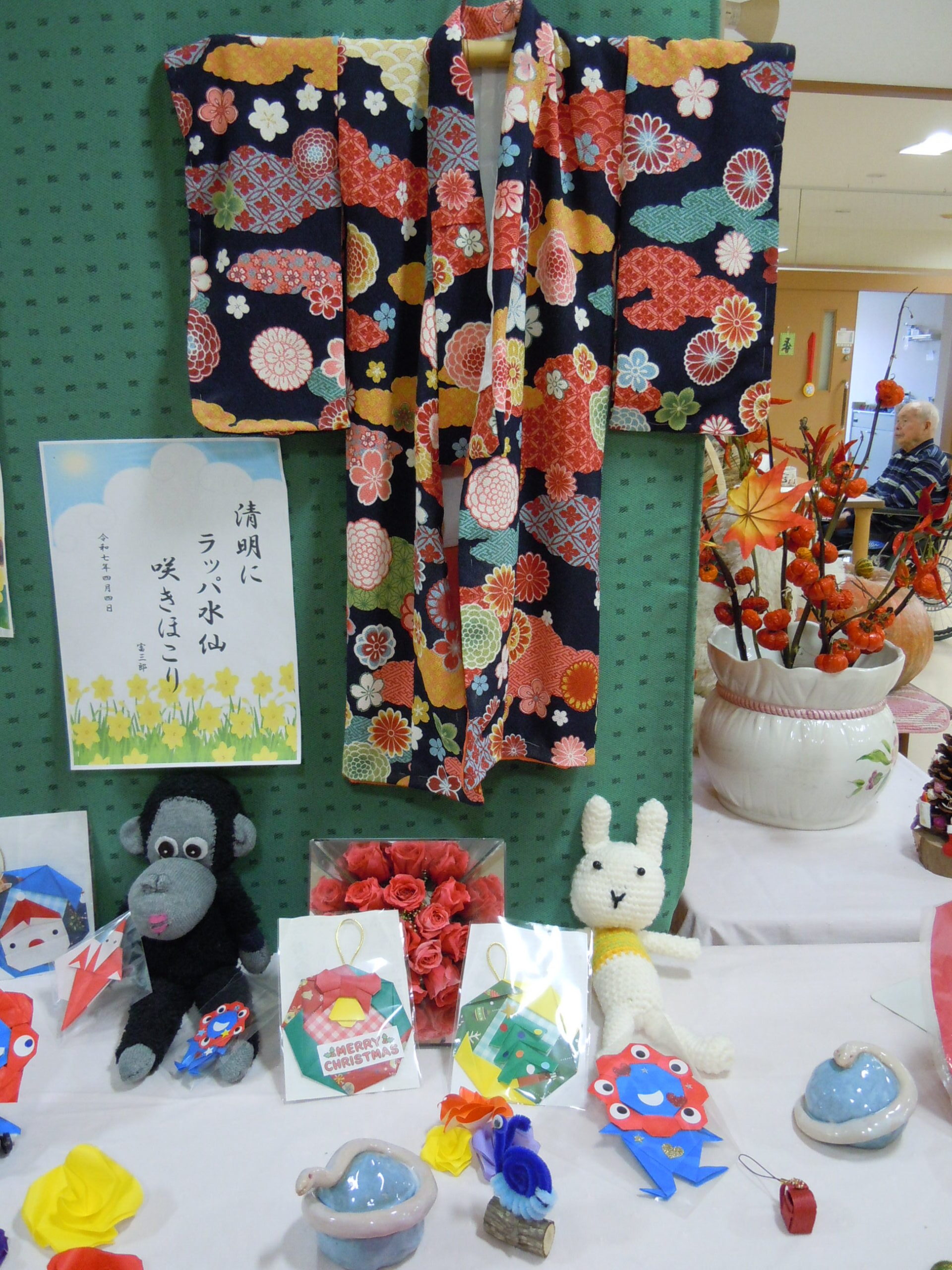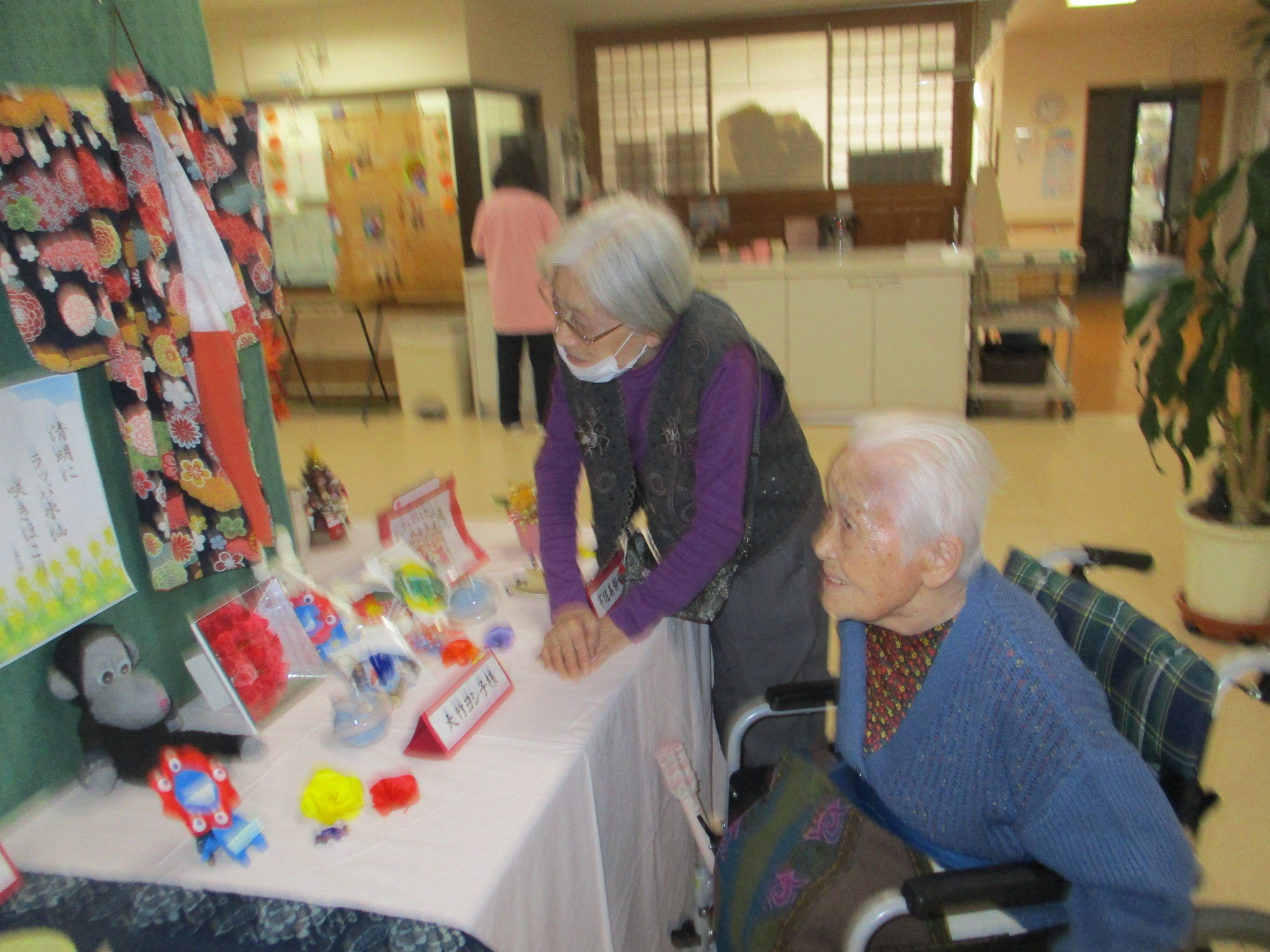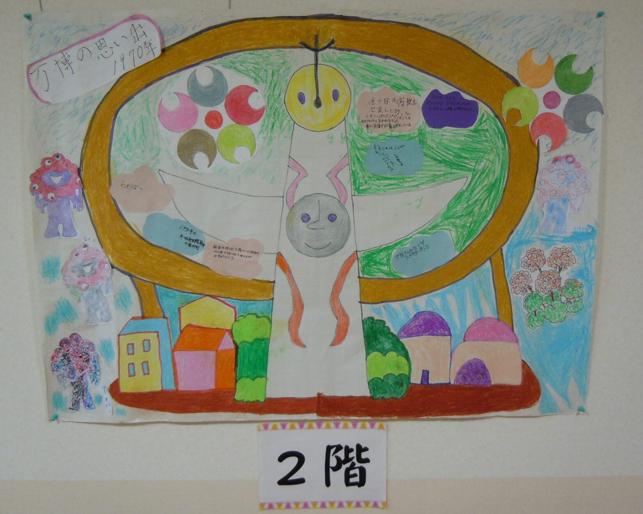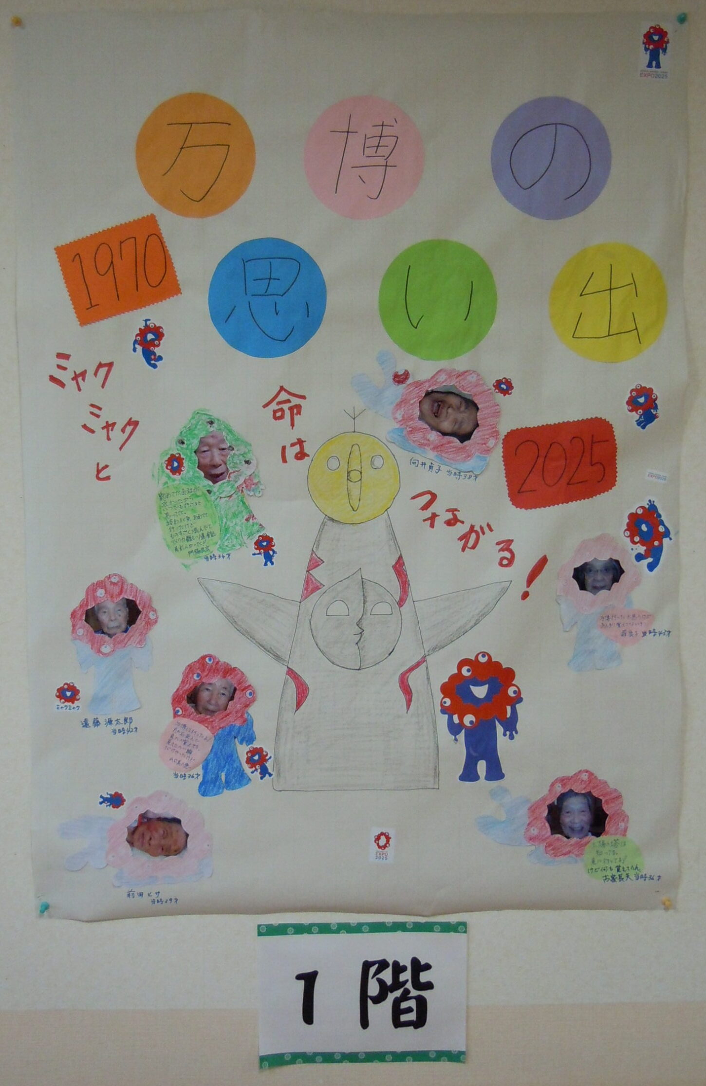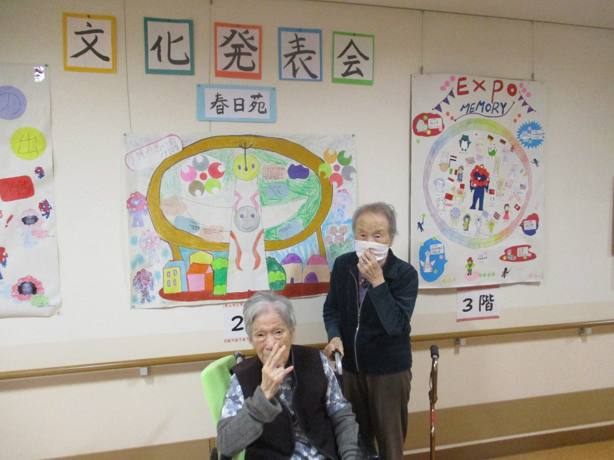 2025年11月30日 アルバム 文化発表会 11月は文化発表会を開催しました。 折り紙や塗り絵・俳句・手芸・絵画・陶芸など、入居者様の色々な作品を展示し皆さまに観てもらいました。「上手だね」「器用に作るね」と熱心に鑑賞されていました。 また、各階ごとに「万博の思い出」をテーマに製作。1970年の大阪万博の思い出や、太陽の塔の絵を描いてもらいました。もちろん今年開催の関西万博マスコットのミャクミャクも!